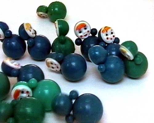 So, too, in the video work 3' Survival Attempts the frontal view of the images, the reduction of the selection of topics to just one central motif and its repetition are factors that play an important role in the mental re-channeling towards what lies behind the given image. Fourteen 'stand-up men' start to move about by means of an unknown power and can no longer be stopped. With ever increasing speed they drop directly into the unknown and disappear accompanied by the loud noise of explosions. 'Stand-up men' are not merely toys for children; they symbolise the capacity of the individuell to cope with problems. Whatever happens - a 'stand-up man' cannot be bowled over by anything and will always get up again, to start from scratch. The video takes up this motif in a literal sense by means of a loop procedure. The intense, almost shot-like banging together of the figures beyond the line of visibility does get 'under one's skin' and is physically perceived. The dolls as size-reduced representatives of human beings imitate the physical sphere and create an image for comparison of human actions within social contexts.
